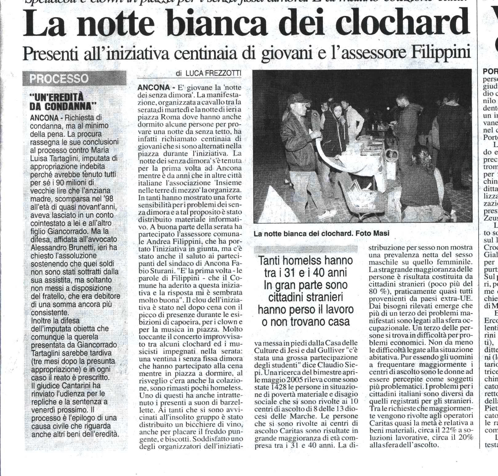 Per anni sono stata volontaria presso un centro di accoglienza per senza fissa dimora, “La tenda di Abramo” di Falconara (An). Ho sempre ascoltato con attenzione le loro storie, a volte mi sono commossa, a volte non ho capito, altre volte ancora ho gioito con qualcuno di loro per un piccolo successo familiare o lavorativo. Alcuni anni fa, il 17 ottobre 2006, in occasione della giornata mondiale di lotta alla povertà, è nata l’idea di portare la “Notte dei senza dimora”, iniziativa di Terre di Mezzo, anche ad Ancona e insieme a colui che sei anni dopo è diventato mio marito siamo riusciti a organizzarla… nell’arco di un paio di settimane!! E’ stata un’importante notte, che rimarrà sempre nel mio cuore e mi rende molto orgogliosa. Grazie all’aiuto della mensa di Padre Guido e Suor Pia, siamo riusciti a offrire molti pasti caldi a persone senza fissa dimora che sono venute a dare un’occhiata, siamo riusciti a sensibilizzare, coinvolgendo i cittadini, attraverso spettacoli e musica, siamo riusciti a immedesimarci nella realtà dei senza fissa dimora: abbiamo infatti dormito in piazza nei sacchi a pelo, condividendo un momento molto particolare, e poi abbiamo fatto colazione insieme con un cornetto. Per avere qualche informazione sulla notte di Ancona cliccate qui.